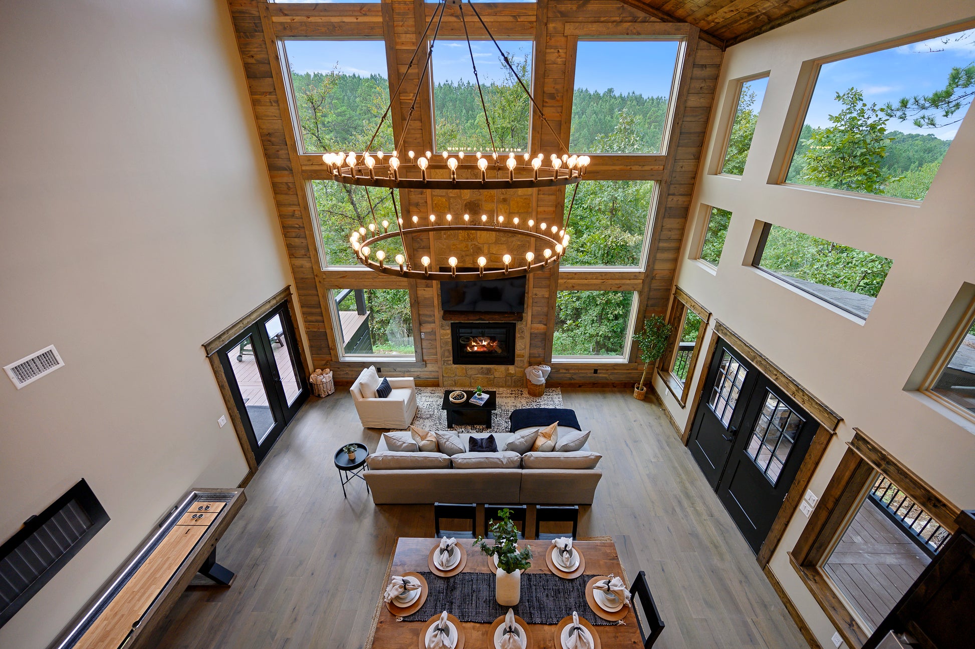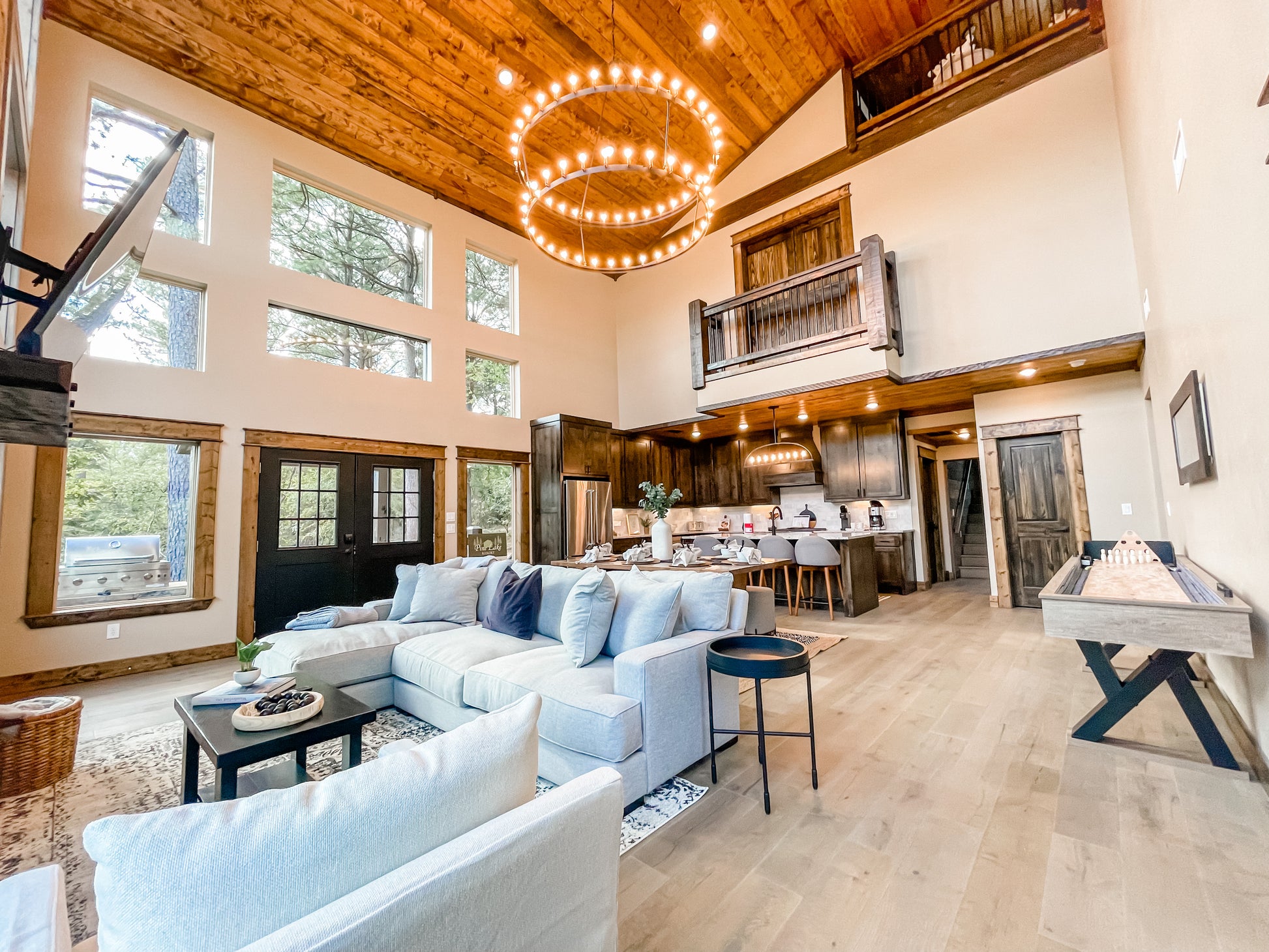 Both cabins have a 3rd story loft. In cabin 1, there are 2 nugget couches, arcade, TV, and it is a play / lounge area.